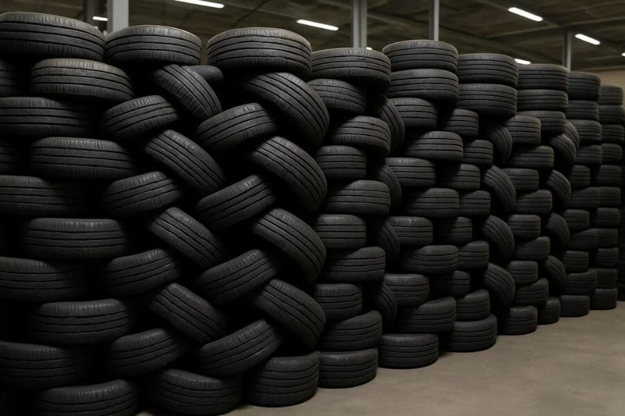 Tires are arranged at an angle, leaning against each other in a “fishbone” pattern. This method improves airflow, reduces deformation, and allows easy access for inventory rotation.